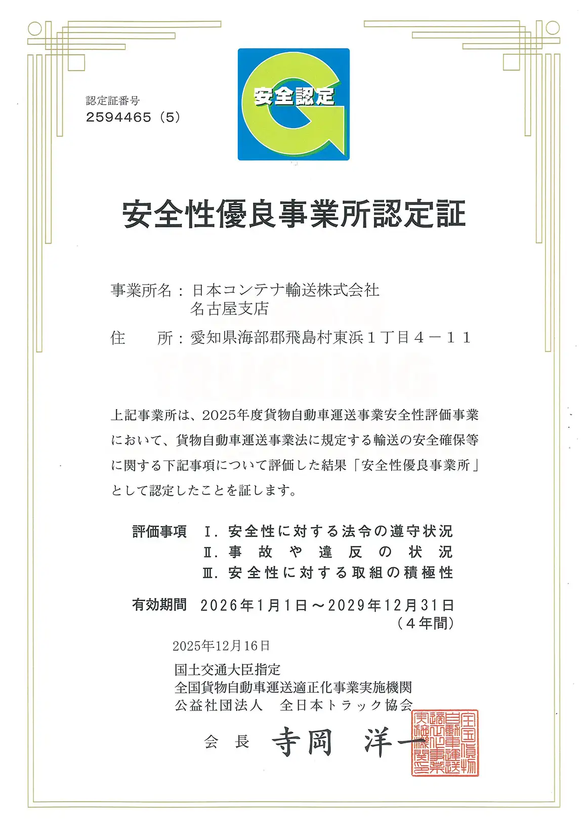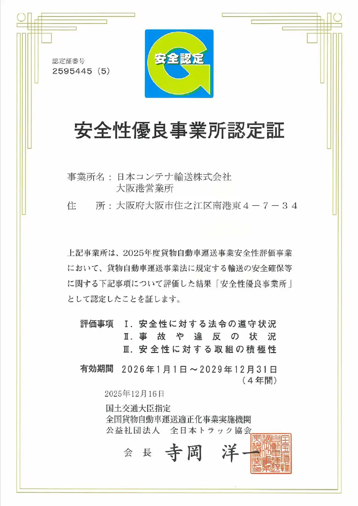 弊社は2008年12月18日に貨物自動車運送事業を行っている5事業所において社団法人全日本トラック協会の「安全性優良事業所(Gマーク)」の認定を受け、2025年12月16日に更新しました。有効期間2026年1月1日~2029年12月31日(4年間)